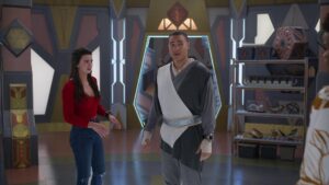 So Amelia and Dr. Akana revived Ollie but he’s still evil as the baddies upped the ante on the blue ranger’s body. Now Zedd has destroyed Dinohenge and the rangers powers are gone. On top of that the base, now in ship mode has gone through to another galaxy and Fern is there after throwing up. Zedd is madder than ever and has spared Ollie’s statue in dinohenge.